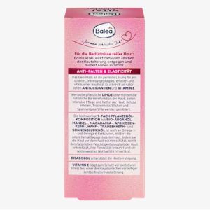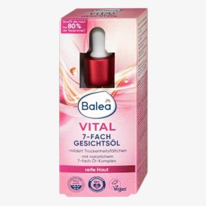 Dầu dưỡng da mặt Balea VITAL 7-fold là giải pháp hoàn hảo cho làn da đẹp, được chăm sóc chuyên sâu, được nghỉ ngơi và tràn đầy sức sống. Sản phẩm giàu chất chống oxy hóa tự nhiên và vitamin E. Các lipid thực vật có giá trị hỗ trợ chức năng hàng rào tự nhiên của da, cung cấp dịch vụ chăm sóc chuyên sâu và giúp da phục hồi. Nếp nhăn do khô và cảm giác căng thẳng được giảm bớt. Thành phần dầu thực vật 7 lớp chất lượng cao gồm dầu argan hữu cơ, hạnh nhân, macadamia, hạt mơ, cây gai dầu, hạt nho và dầu hướng dương giàu axit béo omega-3 và omega-6, làm giảm các dấu hiệu của làn da căng thẳng hàng ngày bằng cách bảo vệ da khỏi bị khô, do đó hỗ trợ cân bằng độ ẩm tự nhiên của da, duy trì độ đàn hồi của da và mang lại cảm giác mềm mại, dễ chịu. Bisabolol giúp làm dịu da. Vitamin E góp phần bảo vệ da khỏi stress oxy hóa, một trong những nguyên nhân chính gây lão hóa da sớm do ánh nắng.