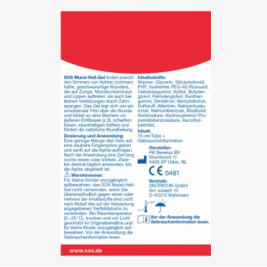 Gel trị nhiệt miệng SOS Mund-Heil-Gel tạo thành màng bảo vệ và hàng rào chống lại các tác động bên ngoài như thức ăn cay hoặc nước ép axit. Nó thúc đẩy quá trình lành vết thương trong trường hợp vết thương nhỏ ở khoang miệng và đảm bảo giảm đau nhanh chóng.