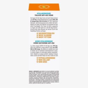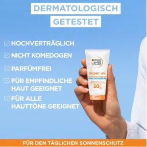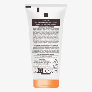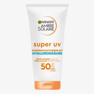 Kem chống nắng Garnier Ambre Solaire Anti-Age Super UV Sun Protection Cream SPF 50 bảo vệ da vĩnh viễn khỏi tia UV. Kem chống nắng chống lão hóa còn chứa axit hyaluronic, giúp giảm nếp nhăn. Nó chống lại các dấu hiệu lão hóa da sớm và mang lại làn da trẻ trung tự nhiên. Axit hyaluronic còn được biết đến với đặc tính giữ ẩm. Công thức còn chứa vitamin B3, giúp ngăn ngừa các vết khô nhỏ. Kết cấu siêu nhẹ, mang lại cho da cảm giác dễ chịu và nhanh chóng được hấp thụ.