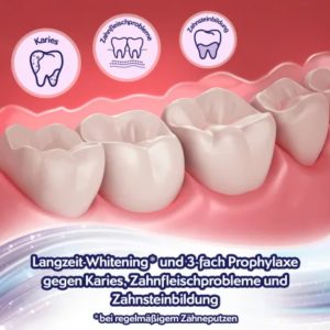Ngoài ra, vi khuẩn gây sâu răng cũng được loại bỏ khỏi răng. Công nghệ Micro Gloss Pearl làm mịn bề mặt răng, ngăn ngừa mảng bám. Chăm sóc răng miệng của bạn với giải pháp phòng ngừa ba tác dụng Odol-med3: chống sâu răng, các vấn đề về nướu và hình thành cao răng. Kem đánh răng chứa chất lỏng thấm sâu vào các khoảng trống giữa các răng và mang lại hơi thở thơm mát đặc biệt.