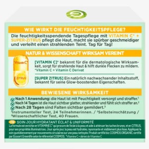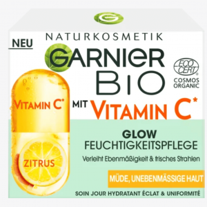 Kem dưỡng ẩm ban ngày Garnier Skin Active Bio Glow với vitamin C giúp chống lại các dấu hiệu mệt mỏi và làn da không đều màu, làm cho làn da mệt mỏi trở nên tươi sáng. Vitamin C đảm bảo làn da rạng rỡ hơn và đồng thời ngăn ngừa các vết thâm nám. Ngoài ra trong kem dưỡng da mặt còn có Super Citrus – thành phần tái tạo tự nhiên mang lại làn da sáng khỏe. Kết quả là mang lại cảm giác da mềm mại và mịn màng hơn rõ rệt và làn da đều màu rạng rỡ nhờ được cung cấp độ ẩm cao.