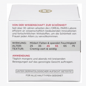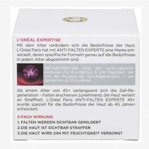 Từ 45 tuổi, làn da giảm hẳn khả năng tự sản sinh collagen, trở nên kém săn chắc và bị lão hóa. Kem dưỡng da Loreal Anti Falten Experte 45+ được phát triển đặc biệt cho các nhu cầu của da từ 45 tuổi. Bổ sung Retino-Peptide, một phức hợp hiệu quả với các pro-retinol A và peptide, giúp kích thích quá trình tái tạo tế bào trong lớp biếu bì, tăng cường sự sản sinh collagen tự nhiên của da. Làn da mịn màng, săn chắc, giảm nếp nhăn và trẻ trung hơn.