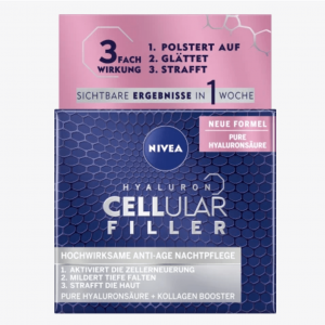 NIVEA HYALURON CELLULAR FILLER làm săn chắc + kích hoạt tế bào chăm sóc ban đêm chống lão hóa được làm giàu với axit hyaluronic, chất tăng cường collagen và chiết xuất hoa mộc lan, do đó kích thích tế bào da của bạn sản xuất axit hyaluronic và collagen của riêng chúng. Công thức cải thiện quá trình tái tạo tế bào và tăng tốc độ tái tạo của da qua đêm. Da của bạn được dưỡng ẩm chuyên sâu và cảm thấy mịn và mượt. Khả năng tương thích với da đã được xác nhận về mặt da liễu.