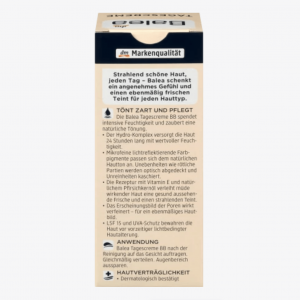 Kem nền Balea BB Heller Hautton cung cấp độ ẩm chuyên sâu và mang lại làn da tự nhiên. Các sắc tố màu phản chiếu ánh sáng siêu nhỏ thích ứng với màu da tự nhiên. Các khuyết điểm như các vùng hơi đỏ được che phủ bằng quang học và các khuyết điểm được che đi. Công thức với vitamin E và dầu hạt đào tự nhiên mang lại cho làn da vẻ mệt mỏi sự tươi trẻ, khỏe mạnh và một làn da rạng rỡ. Sự xuất hiện của các lỗ chân lông được tinh chỉnh – cho một làn da đều màu. SPF 15 và bảo vệ khỏi tia UVA bảo vệ da khỏi lão hóa da sớm do ánh sáng gây ra. Công thức không chứa vi nhựa và polyme tổng hợp hoàn toàn, hòa tan trong nước.