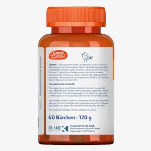 Chất tạo ngọt maltitol, tinh bột biến tính, vitamin C, chất tạo axit citric, niacin, chất tạo màu thực phẩm cô đặc (cà rốt, táo, nho đen, anh đào), vitamin E, hương cam tự nhiên, hương vị tự nhiên, dầu thực vật (dừa, hạt cải dầu), vitamin B6, chất tạo ngọt sucralose, chất tạo bóng sáp carnauba, vitamin A, axit folic, biotin, vitamin D, vitamin B12.