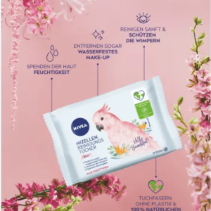 Khăn ướt tẩy trang NIVEA® 3in1 micellar với vitamin E: loại bỏ lớp trang điểm và thậm chí cả mascara không thấm nước, đồng thời làm sạch kỹ lưỡng nhưng đặc biệt nhẹ nhàng. Dưỡng ẩm và làm mới làn da. Khăn lau bảo vệ sự cân bằng độ ẩm tự nhiên của da và phù hợp với mọi loại da – lý tưởng để sử dụng hàng ngày. Khăn lau làm sạch micellar đảm bảo làn da tươi mới và khỏe mạnh. Những chiếc khăn mềm được làm từ sợi vải 100% có nguồn gốc từ thiên nhiên. Công thức dịu nhẹ chứa các thành phần có nguồn gốc 97% tự nhiên và hoàn toàn không chứa hạt vi nhựa.