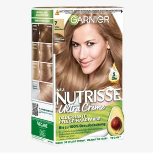 Garnier Nutrisse Ultra Creme số 7 Toffee Mittelblond cung cấp cho tóc sự chăm sóc chuyên sâu, bởi công thức được làm giàu với 5 loại dầu trái cây: ô liu, hạt hạt mỡ, bơ, nam việt quất và tinh dầu argan nuôi dưỡng tóc chuyên sâu và làm cho tóc mềm mại. Công thức bảo vệ tóc không bị khô trong thời gian dài và che phủ tóc bạc một cách hoàn hảo.