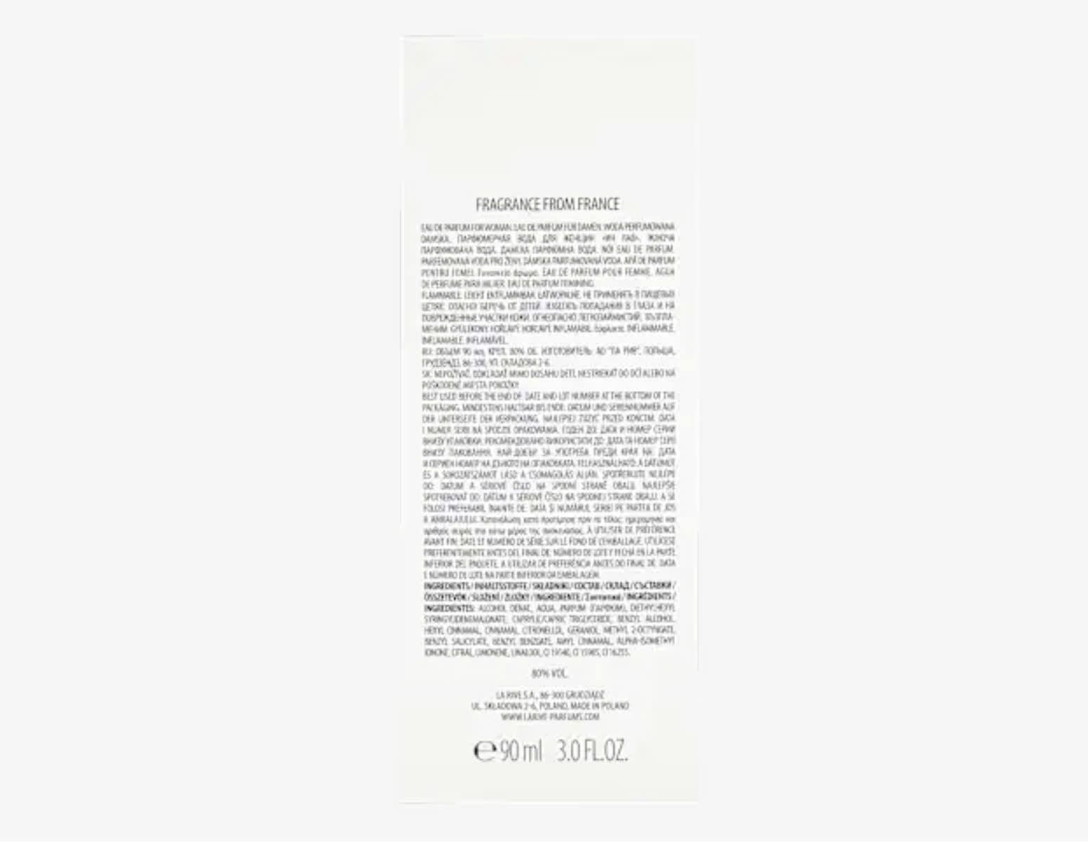 Một loại nước hoa hương hoa trái cây dành cho người phụ nữ gợi cảm nhưng thanh lịch, tràn đầy sức sống, có năng lượng và sức hút phi thường. Bước vào khu vườn đầy hoa trắng – quyến rũ và thanh lịch… Giống như bạn! Hãy để các giác quan của bạn đắm chìm trong mùi hương quyến rũ của hoa linh lan, hoa nhài và hoa hồng. Trải nghiệm sự kỳ diệu của hoa mộc lan nở rộ, cùng với các loại trái cây ngon ngọt tuyệt vời: lê, dưa, đào và quýt. Cảm nhận hương thơm nhẹ nhàng của hoa lan Nam Phi và hoa lan, kết hợp với hương thơm quyến rũ của hoa ngọc lan tây. Hãy để bản thân được nuông chiều bởi hương ấm áp của xạ hương và gỗ tuyết tùng với hương vani mềm mại và lắng nghe trực giác của bạn… LA RIVE IN LOVE – cuộc sống của bạn tràn ngập những khoảnh khắc thú vị!