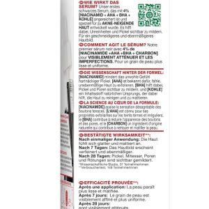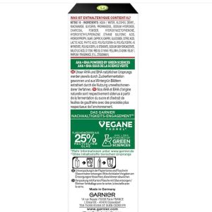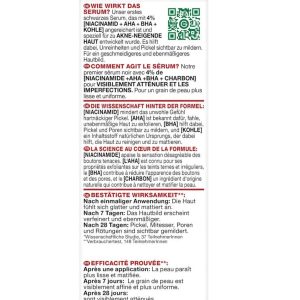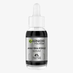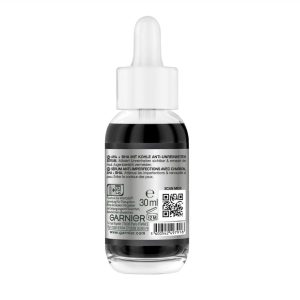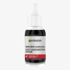 Serum Garnier AHA + BHA than hoạt tính được đặc chế dành riêng cho làn da dễ bị mụn đầu đen, mụn trứng cá, lỗ chân lông to và mẩn đỏ. Sản phẩm chứa than hoạt tính, 4% niacinamide, cùng AHA và BHA. Các thành phần này làm giảm rõ rệt các vết thâm và đốm nâu, đồng thời tái tạo làn da, mang lại làn da mịn màng và đều màu hơn.
