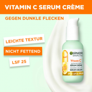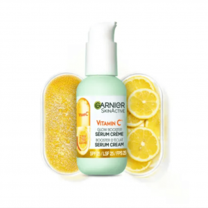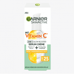 Serum-kem dưỡng Garnier vitamin C Glow Booster kết hợp các đặc tính của kem dưỡng ẩm với hiệu quả đặc biệt của huyết thanh. Làn da được cung cấp độ ẩm chuyên sâu và trở nên mềm mại và dẻo dai. Huyết thanh giàu dưỡng chất lý tưởng để sử dụng cho làn da mệt mỏi và không đều màu. Công thức 2 trong 1 còn chứa Vitamin C Deriuctor và Super Citrus, kết hợp để tạo hiệu ứng da sáng rạng rỡ. Các đốm đen cũng giảm đi rõ rệt với kem dưỡng da mặt này và làn da ngày càng được cải thiện. Sản phẩm chăm sóc ban ngày cũng chứa chỉ số chống nắng 25, giúp bảo vệ da khỏi lão hóa sớm do ánh sáng gây ra. Chăm sóc tối ưu cho làn da đều màu và tươi tắn hơn với hiệu ứng sáng da.