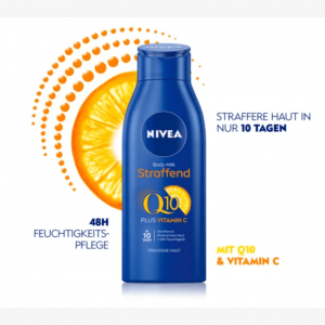 Sữa dưỡng thể làm săn chắc NIVEA Q10 được làm giàu với hai chất chống oxy hóa hiệu quả cao: Q10 và vitamin C. Q10 cùng với creatine và L-carnitine được hấp thụ nhanh chóng làm săn chắc da và cung cấp độ ẩm cho da. Q10 kết hợp với dầu macadamia làm săn chắc và dưỡng ẩm cho làn da khô. Vitamin C giúp da trắng sáng, mịn màng. Làn da của bạn săn chắc và độ đàn hồi được cải thiện rõ rệt chỉ trong 10 ngày. Cho cảm giác da đẹp và săn chắc.