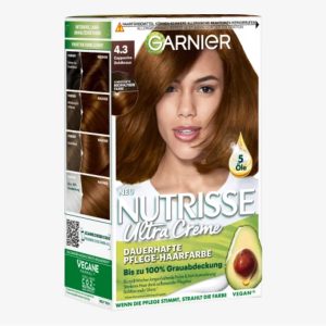 Garnier Nutrisse Creme số 4.3 Cappucino Goldbraun cung cấp cho tóc sự chăm sóc chuyên sâu, bởi công thức được làm giàu với 5 loại dầu trái cây: ô liu, hạt mỡ, bơ, nam việt quất và tinh dầu argan nuôi dưỡng tóc chuyên sâu và làm cho tóc mềm mại. Công thức bảo vệ tóc không bị khô trong thời gian dài và che phủ tóc bạc một cách hoàn hảo.