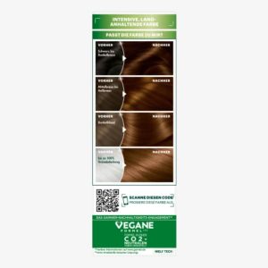 Màu 4.3 Cappucino Goldbraun – nâu vàng cappucino – mang lại cho tóc vẻ bóng mượt rạng rỡ và màu nâu sô cô la ấm áp. Ngay cả tóc bạc cũng được che phủ 100%. Kết quả là một màu nâu đậm với độ dốc màu hài hòa, tỏa sáng mạnh mẽ trong 8 tuần.