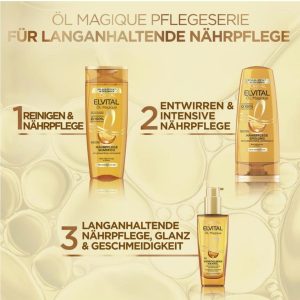 Dầu dưỡng tóc Elvital Magique dành cho mọi loại tóc giúp làm mượt tóc xơ rối, mang lại sự mềm mại và bóng mượt. Sản phẩm chăm sóc chuyên sâu này, được làm giàu với sáu loại tinh dầu hoa quý giá, nuôi dưỡng tóc từ sâu bên trong và bảo vệ tóc khỏi tình trạng khô xơ. Dầu dưỡng còn mang lại hương thơm phương Đông và bảo vệ tóc khỏi tác hại của việc tạo kiểu bằng nhiệt lên đến 230°C.