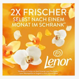 Khám phá nước hoa giặt ủi Lenor mang đến hương thơm tươi mát KHÔNG NGỪNG cho quần áo giặt của bạn và lưu hương lên đến 12 tuần trong tủ. Lenor Golden Orchid mang đến cho quần áo của bạn hương thơm quyến rũ, thanh lịch và nhẹ nhàng của hương vani quý phái và hương hoa. Chỉ cần thêm trực tiếp vào lồng giặt sau mỗi lần giặt và điều chỉnh liều lượng theo cường độ hương thơm mong muốn.