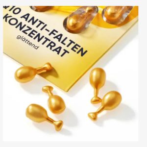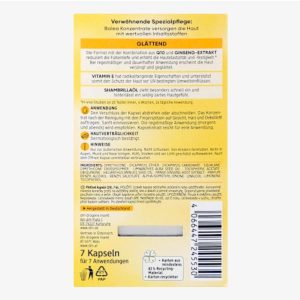 Viên nang Balea Q10 Anti Falten Konzentrat là tinh chất dưỡng da cô đặc, được thiết kế dưới dạng viên nang tiện lợi. Chăm sóc đặc biệt với các thành phần hoạt tính: Q10 và chiết xuất nhân sâm giúp giảm độ sâu của nếp nhăn và tăng độ đàn hồi và săn chắc cho da. Khi sử dụng thường xuyên và lâu dài, làn da sẽ trông mịn màng và trẻ trung hơn. Vitamin E có đặc tính loại bỏ gốc tự do và do đó hỗ trợ bảo vệ da khỏi tác động của môi trường do tia UV gây ra. Dầu Shambrilla cũng được hấp thụ đặc biệt nhanh chóng và mang lại cho làn da cảm giác mềm mại như lụa.
