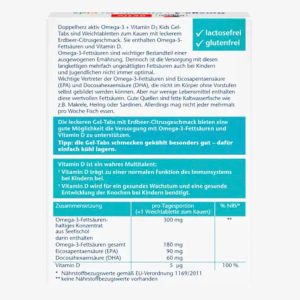 Viên nhai Doppelherz aktiv Omega-3 + Vitamin D3 Kids Gel-Tabs là viên nén nhai mềm có hương vị dâu tây-cam quýt thơm ngon. Chúng chứa axit béo omega-3 thiết yếu và vitamin D.