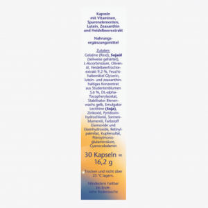 axit L-ascorbic, gelatin , dầu đậu nành, dầu ô liu, Chiết xuất từ quả việt quất (phần chữa khỏi) 9,2%, luteinhaltiges- và zeaxanthinhaltiges tập trung từ cúc vạn thọ 5,5%, glycerin, DL-alpha-tocopheryl acetate, humectant sorbitol, Emulgator Lecithine (SOJA), chất ổn định sáp ong, kẽm oxit, pyridoxine hydrochloride, retinyl palmitate, Farbstoffe Eisenoxide und Eisenhydroxide,, đồng sunfat, Pteroylmonoglutaminsäure, cyanocobalamin