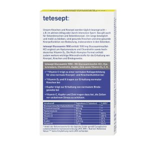 tetesept Glucosamine 1550 chứa 1550 mg glucosamine sulfate KCl bổ sung axit hyaluronic và chondroitin cũng như vitamin D3 liều cao. Công thức đa phức hợp còn chứa các vi chất dinh dưỡng quan trọng khác để duy trì sụn, xương và mô liên kết: