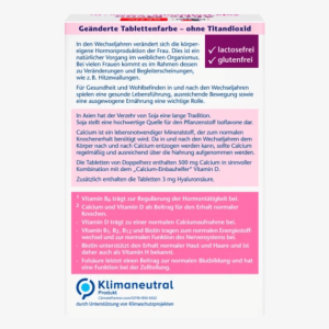 - Thành phần: canxi cacbonat, isoflavonhaltiges tinh chất mầm đậu nành 7,3%, Fullstoff Gummi arabicum, Fullstoff mikrokristalline Cellulose, Trennmittel Siliciumdioxid, Fullstoff Cellulose, Fullstoff vernetzte Carboxymethylcellulose, hyaluronsäurehaltiges Kollagenhydrolysat 1,7 %, Uberzugsmittel Hydroxypropylmethylcellulose, Trennmittel Calciumsalze der Speisefettsäuren, Farbstoff Titandioxid, Uberzugsmittel Schellack, Trennmittel Talkum, Cyanocobalamin, Olivenol, Pyridoxinhydrochlorid, Thiaminmononitrat, Riboflavin, Farbstoff Eisenoxide und Eisenhydroxide, Emulgator Polysorbat 80, Pteroylmonoglutaminsäure, D-Biotin, Cholecalciferol