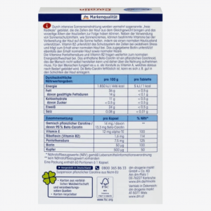 Gelatin, 25,9% caroten thực vật (dầu ô liu, caroten thực vật), chất béo thực vật (dừa, hạt cọ), humectant: glycerin, D-alpha-tocopherol, canxi-D-panthotenate, chất ổn định: sáp ong (vàng) , chất nhũ hóa: Lecitin (SOYA), humectant: sorbitol, riboflavin, (vitamin B2), đồng sunfat, biotin, thuốc nhuộm: oxit sắt và hydroxit sắt và titan dioxide.