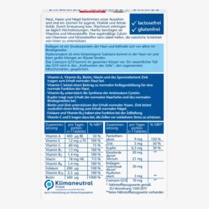 - Vitamin A, vitamin B2, biotin, niacin và sự giúp đỡ của yếu tố vi lượng kẽm trong mỗi viên uống Doppelherz Haut Haare Nagel duy trì làn da bình thường, sáng, mịn.