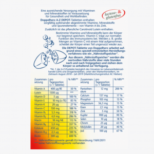 Chỉ với 1 viên Doppelherz AZ DEPOT Complete mỗi ngày, bạn đã cung cấp cho cơ thể nhiều vitamin, khoáng chất và nguyên tố vi lượng quan trọng cộng với lutein trong nhiều giờ trong ngày.