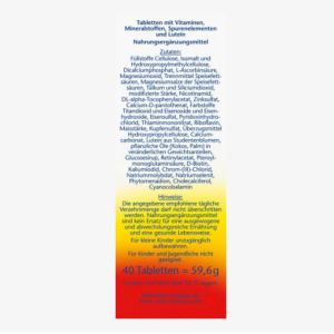 Thành phần: chất độn cellulose, isomalt và hydroxypropylmethylcellulose, dicalcium phosphate, L-ascorbic acid, magnesium oxide, chất chống đóng cục, axit béo, muối magiê của axit béo, talc và silicon dioxide, tinh bột biến tính, nicotinamide, DL-alpha-tocopheryl acetate , kẽm sunfat, canxi D-pantothenate điôxít và Sắt oxit và hydroxit sắt, sắt sunfat, pyridoxine hydrochloride, thiamine mononitrate, riboflavin, tinh bột ngô, đồng sunphat, chất phủ hydroxypropyl cellulose, canxi cacbonat, lutein từ cúc vạn thọ, dầu thực vật (dừa, cọ) với tỷ lệ thay đổi, xi-rô glucose, retinylacetate, biotaminoyl monoglioyl (III) -clorua, natri molybdate, natri selenit, phytomenadione, cholecalciferol, cyanocobalamin