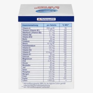 Thành phần: canxi photphat, magie oxit, hydroxypropylmethylcellulose, axit L-ascorbic (vitamin C), cellulose vi tinh thể, maltodextrin, canxi cacbonat, sắt fumarate, DL-a-tocopheryl acetate (vitamin E), nicotinamide, Canxi D-pantothenate, kẽm citrate, muối magie của axit béo, pyridoxine hydrochloride (vitamin B6), đồng sunfat, riboflavin (vitamin B2), thiamine mononitrate (vitamin B1), mangan sunfat, silicon dioxide, oxit sắt và hydroxit sắt (E 172), lutein, retinyl acetate (Vitamin A), Axit Pteroylmonoglutamic (Axit folic), Crom (III) clorua, Kali iodat, Natri molybdat, D- biotin, natri selenite, phylloquinone (vitamin K1), cholecalciferol (vitamin D3), cyanocobalamin (vitamin B12).
