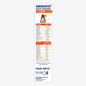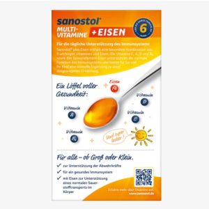 Sanostol® plus Eisen chứa các vitamin quan trọng và sắt nguyên tố vi lượng quan trọng, góp phần vận chuyển oxy bình thường trong cơ thể. Sắt và vitamin A, C, D và B6 góp phần vào hoạt động bình thường của hệ thống miễn dịch. Với một thìa mỗi ngày, bạn có thể bổ sung chế độ ăn uống của mình một cách có mục tiêu và đặc biệt ngon miệng
