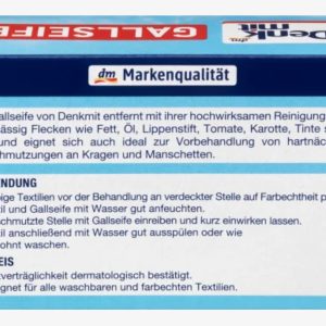 Bánh xà phòng của Denkmit là giải pháp lý tưởng để xử lý vết bẩn mục tiêu. Nhờ công thức hiệu quả cao, vết dầu mỡ, dầu, son môi, cà chua và cà rốt và mực đã trở thành quá khứ. Ngay cả vết máu cũng có thể được loại bỏ bằng xà phòng tẩy rửa. Đơn giản chỉ cần làm ẩm vải và xà phòng bằng nước, chà xát, sau đó để nó hoạt động trong thời gian ngắn, rửa sạch và bạn sẽ có được kết quả tuyệt vời. Để có bộ quần áo đẹp rạng ngời không tì vết!